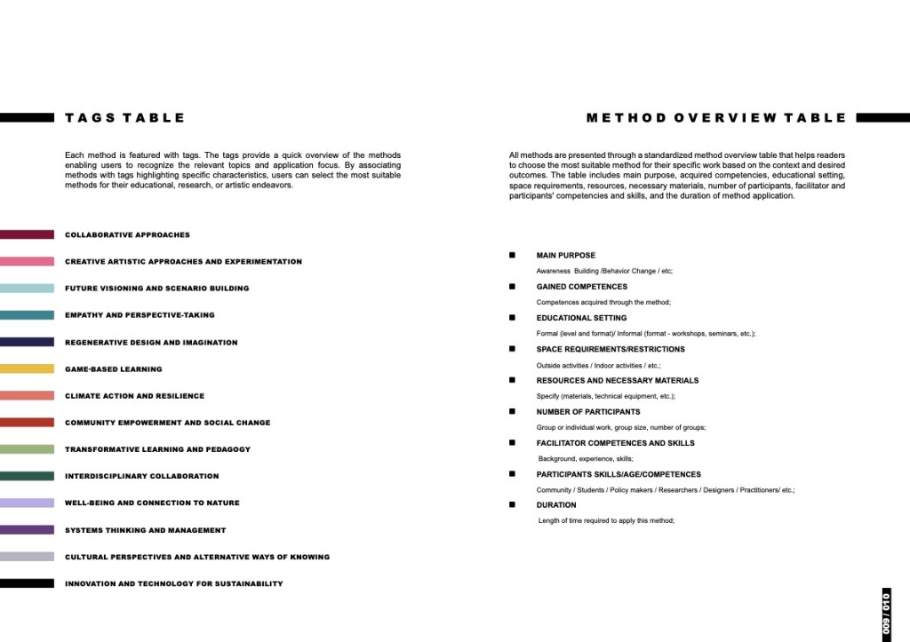 Designed with user-friendliness in mind, it facilitates navigating among different methods easily through tags and tables, supporting researchers and educators to identify suitable methods and tools for their specific context. It comprises a resource for researchers, educators, lecturers, community workers, and change-makers in the broadest sense, who wish to foster competencies in the areas of regenerative design, climate action, trans-formative research and sustainability education.